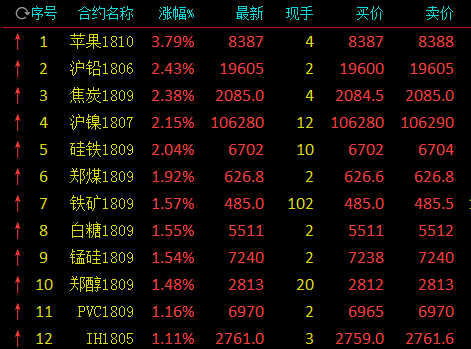 截止午盤收盤,蘋果漲3.79%,滬鉛漲2.43%,焦炭漲2.38%,滬鎳漲2.15%,硅鐵漲2.04%,動力煤漲1.92%,鐵礦石漲1.57%;跌幅方面,鄭麥跌0.95%,原油跌0.94%,豆粕跌0.68%,菜粕跌0.63%。